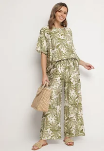 Ciemnozielony Wiskozowy Komplet z Motywem Roślinnym Szerokie Spodnie i T-shirt Evianira