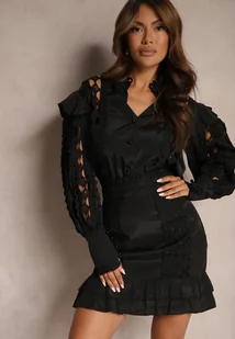 Czarny Ażurowy Komplet z Dodatkiem Bawełny Koszula z Perełkowymi Guzikami i Spódnica Leniyana