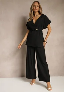 Czarny Komplet Garniturowy Szerokie Spodnie i Marynarka z Paskiem Solsedi