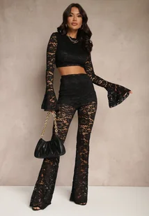 Czarny Komplet z Koronki Spodnie Flare i Bluzka Nanillia