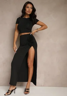 Czarny Komplet z Wiskozą Spódnica z Kwiatami 3D i Krótka Koszulka Redelle