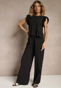 Czarny Komplet z Wiskozą Spodnie o Szerokim Kroju i Bluzka z Baskinką Evellimi