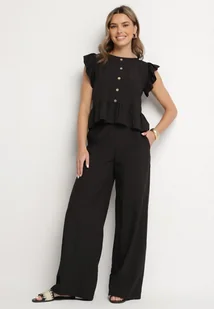 Czarny Komplet z Wiskozą Szerokie Spodnie i Bluzka z Falbankami Villimi