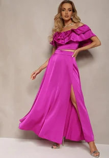 Fioletowy Komplet z Bluzką Hiszpanką z Falbankami i Spódnicą z Długim Rozcięciem na Boku Cevana