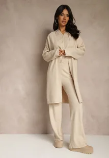 Jasnobeżowy Komplet z Dzianiny z Wełną Długi Kardigan Kamizelka i Spodnie Netivia
