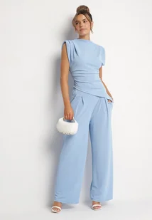 Jasnoniebieski Komplet Bluzka z Zaznaczonymi Ramionami i Spodnie Szerokie na Gumce Divaires