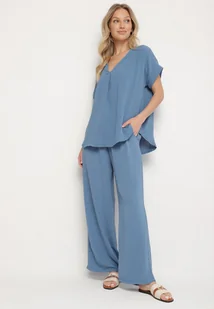 Jasnoniebieski Komplet z Wiskozą Koszulka z Krótkim Rękawem i Luźne Spodnie na Gumce z Kieszniami Efraline