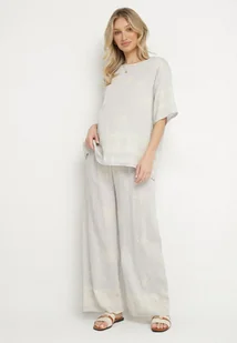 Jasnoszary Komplet z Wiskozą w Stylu Rustykalnym Bluzka i Szerokie Spodnie Ronilae