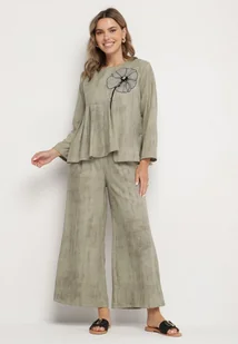 Jasnozielony Komplet Bluzka z Rozkloszowanym Dołem i Aplikacją Kwiatka i Luźne Spodnie Ravirisa