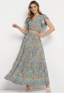Niebieski Komplet 2-Częściowy we Wzór Paisley z Wiskozy Spódnica Maxi i Kopertowa Góra Wabila