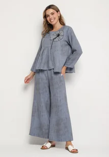 Niebieski Komplet Bluzka z Rozkloszowanym Dołem i Aplikacją Kwiatka i Luźne Spodnie Ravirisa