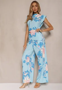 Niebieski Komplet Marszczona Bluzka o Asymetrycznym Kroju i Szerokie Spodnie w Kwiaty Linidia