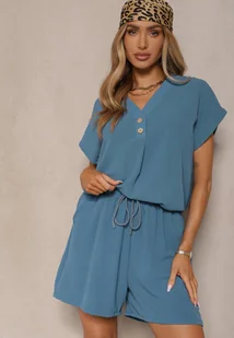 Niebieski Komplet z Wiskozą Bluzka Zdobiona Guzikami i Szorty Nitamea