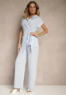 Niebieski Komplet ze Spodniami o Szerokim Kroju i Koszulą z Ozdobnym Wiązaniem Filaniella