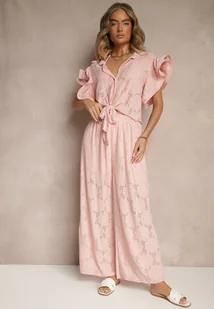 Różowy Ażurowy Komplet Koszulowa Bluzka z Wiązaniem i Szerokie Spodnie Linarisa