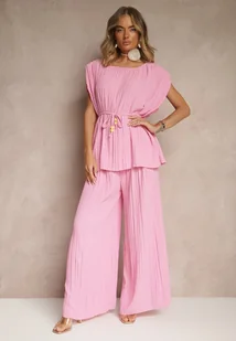 Różowy Komplet Spodnie o Szerokim Kroju i Bluzka z Usztywnioną Linią Ramion Nilamira
