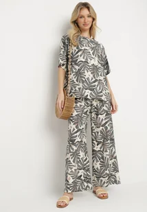 Szary Wiskozowy Komplet z Motywem Roślinnym Szerokie Spodnie i T-shirt Evianira
