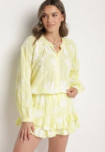 Żółty Bawełniany Komplet Koszula z Szerokimi Rękawami i Spódnico-Spodenki Savrise