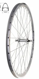 Koło przednie 28", obręcz stożkowa XMX srebrna, piasta aluminiowa na łożyskach maszynowych + nakrętki