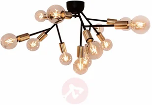 12-Punktowa lampa sufitowa Hero o barwie szlachetnej czerni -efektowny wygląd i imponująca funkcjonalność Lampa sufitowa Hero zachwyca skutecznym połączeniem prostych kształtów geometrycznych, które tworzą złożoną i jednocześnie harmonijną całość. Ta 12-punktowa lampa ma barwę dyskretnej, szlachetnej czerni, która skutecznie odróżnia się od ciepłej stylistyki mosiężnych opraw, zapewniając tym samym dynamiczny wygląd całości. Dodatkowy plus to różnorodność, którą można osiągnąć na życzenie dzięki zastosowaniu żarówek o różnych kształtach w kilku rozmiarach. Lampa sufitowa Hero z dwunastoma ramionami świetlnymi doskonale współgra z nowoczesnym stylem wyposażenia oraz racjonalistycznymi koncepcjami aranżacji wnętrz w stylu industrialnym. Ta 12-punktowa lampa sufitowa Hero wygląda równie przekonująco na przestronnym poddaszu, w dużej kuchni, pokoju mieszkalnym lub nawet w szerokim korytarzu.