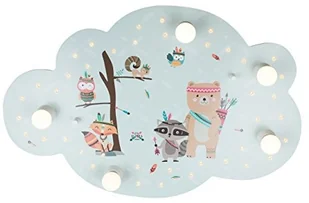 Światło sufitowe Mali Indianie w postaci chmury obrazkowej Lampa sufitowa Little Indians to drewniane światło w kształcie chmurki, które oprócz pięciu lamp E14 jest wyposażone w ciepłobiałe diody LED. Motyw ten został zaprojektowany w sposób przyjazny dla dzieci i zwierząt w stylu indyjskim. Obłok obrazu wykonany jest z drewna i zaprojektowany z użyciem lakierów wodorozcieńczalnych. Motyw przedstawia różne zwierzęta leśne, które są ozdobione jako Indianie. Ze strzałkami, piórami i nakryciem głowy prezentują się one w sposób przyjazny dla dzieci na miętowym, zielonym tle.