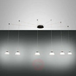 Sześciopłomieniowa oprawa wisząca LED Arabella z zawieszeniem zdecentralizowanym Oprawa wisząca Arabella LED charakteryzuje się sześcioma szklanymi kloszami, które zapewniają równomierne oświetlenie pomieszczenia. Daszek ma osiem szczelin, dzięki czemu kabel świetlny może być używany w sposób zmienny. W zakres dostawy wchodzi sześć deflektorów, które umożliwiają zdecentralizowane zawieszenie. Klosze wykonane są ze szkła satynowanego, co zapewnia bezodblaskową emisję światła. Jednocześnie diody LED mogą być regulowane za pomocą ściemniaczy fazowych wiodących lub śledzących, dzięki czemu oprócz jasnego oświetlenia pomieszczenia można stworzyć przytulną atmosferę.