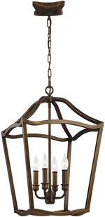 Klasyczna, w nowoczesnym wydaniu, lampa wisząca na łańcuchu, inspirowana lampami antycznymi, do dużych wnętrz, na cztery żarówki świeczki umieszczone w metalowej, oprawie w kształcie starej latarni - lampionu bez szybek. Ta przemyślana lampa pasuje do wysokich, obszernych wnętrz klasycznych, retro, vintage, pałacowych, ale też industrialnych, do holu, kuchni, jadalni, salonu, sypialni i łazienki. Wraz z kinkietami z tej samej serii stworzy niezapomnianą, ponadczasową aranżację świetlną. OPIS LAMPY: - źródło światła: