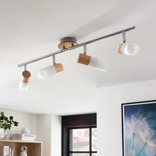 Podłużna drewniana lampa sufitowa LED Krzysztof z czterema wąskimi, cylindrycznymi szklanymi kloszami Krzysztof doskonale pasuje do salonu lub sypialni. Ta lampa sufitowa LED emituje tam przytulne światło, ponieważ klosze są wykonane z białego szkła i mają w sobie nieco naturalności, którą przywołują elementy drewniane. Każdy klosz można obracać i odchylać niezależnie od innych, co pozwala dowolnie regulować natężenie światła. Dostarczone w zestawie żarówki LED odznaczają się niskim zużyciem energii i długą żywotnością.