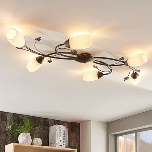 Sześciopunktowa lampa sufitowa LED Stefania o romantycznym wyglądzie, z technologią easydim Stefania to lampa sufitowa LED o niepowtarzalnym romantycznym wyglądzie, która dzięki białym kloszom daje piękne, równomierne światło. Ramiona lamp są romantycznie wygięte i uzupełnione metalowymi dekoracjami w kształcie liści. Dodatkowo czarna powierzchnia podstawy pokryta jest złotymi, delikatnymi pociągnięciami pędzla, co doskonale pasuje do ogólnego wyglądu lampy. Jeśli chcemy ściemnić tę lampę sufitową LED, nie potrzebujemy żadnych dodatkowych akcesoriów, gdyż zamiast nich możemy użyć przełącznika na ścianie. Jeśli lampa jest już załączona, w celu ściemnienia szybko ją wyłączamy i znów ponownie załączamy (w czasie krótszym niż dwie sekundy).