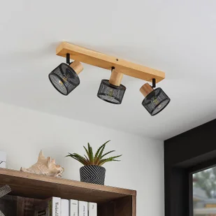 Trendowy reflektor sufitowy Evinora z trzema palnikami Sufitowy reflektor Evinora przekonuje nowoczesnym wzornictwem, które łączy w sobie zarówno efektowne jak i naturalne elementy. Trzy klosze są wykonane ze stali i mają czarne wykończenie powierzchni. Otwarta siatka optyczna daje specjalne efekty świetlne i cieniowe po włączeniu światła. Dzięki trzem palącym się punktom, jeszcze większe salony lub korytarze mogą być dobrze oświetlone. Rama wykonana z drewna nadaje lampie ciepłą i przyjemną atmosferę, dzięki czemu Evinora wprowadza przytulność do pomieszczenia nawet po jego wyłączeniu.