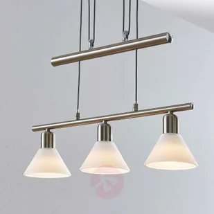 3-punktowa lampa wisząca belka Delira z białym szkłem i możliwością regulacji wysokości Delira to elegancka lampa wisząca belka wykonana z metalu w kolorze niklu i białych szklanych kloszy, która doskonale sprawdzi się nad stołem w jadalni. Przydatną funkcją jest możliwość dowolnej zmiany wysokości za pomocą konstrukcji linowej oraz ustawiania jej każdego dnia na nowo. Światło jest przyjemne i przytulne, a oprawa E14 pasuje do szerokiej gamy żarówek, również z technologią LED i wyjątkowo ciepłą barwą światła.