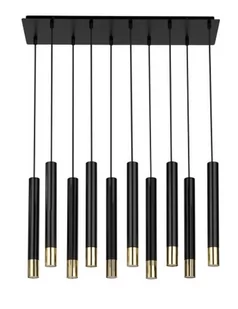 Lampa wisząca 10 punktowa z metalowymi kloszami w kształcie tuby wykończona w kolorze czarnym ze złotymi wstawkami. Możliwość regulowania wysokości. Prosta forma sprawia, że idealnie wkomponuje się w każde wnętrze nadając mu ponadczasowego stylu i charakteru.