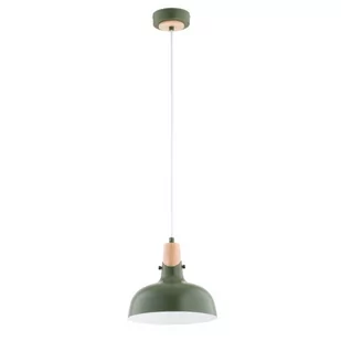 Lampa wisząca 1 punktowa z metalowym kloszem. Elementy metalowe wykończone w kolorze zielonym w połączeniu z elementami drewnianymi w kolorze naturalnym. Możliwość skrócenia wysokości lampy.
