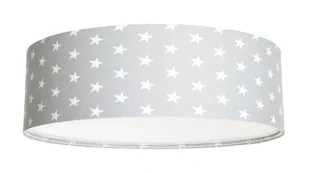 tkanina welurowa z kolorowym nardukiem na tworzywie PCV, metalowa podsufitka, mleczna blenda Kolor: szary+białe gwiazdki Źródło światła: E27, 2x60W Wymiary: średnica abażura: 40 cm wysokośc abażura: