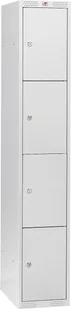 Szafa schowkowa CLASSIC, 1 moduł, 4 schowki, 1740x300x550 mm, szary. Szafa na rzeczy osobiste z 4 schowkami w pionie. Wzmocnione drzwi na zawiasach, z gumową amortyzacją zapewniającą ciche zamykanie. Otwory wentylacyjne w górnej i dolnej części. Wiele podstaw do wyboru.