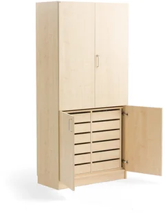 Szafa z podwójnymi drzwiami. Górna część jest zamykana i wyposażona w przestawne półki. W dolnej części znajdują się szuflady. Szafa do przechowywania posiada wytrzymałe powierzchnie. Wysoka szafa do dyskretnego przechowywania materiałów rzemieślniczych, stolarki, tekstyliów itp.
