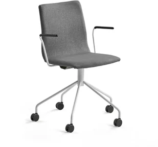 Eleganckie krzesło konferencyjne z podstawą 5-ramienną i pięcioma kołami. Siedzisko zintegrowane z oparciem. Krzesło tapicerowane wytrzymałą tkaniną. Wyposażone w smukłe podłokietniki. Elegancki design sprawia, że krzesło to stylowy dodatek do sali konferencyjnej. To stylowe krzesło konferencyjne doda atrakcyjności każdej sali konferencyjnej. Krzesło posiada siedzisko zintegrowane z oparciem oraz miękką wyściółkę zapewniającą wygodę nawet podczas długich narad. Oparcie delikatnie profilowane, siedzisko z zaokrągloną przednią krawędzią dla dodatkowego komfortu. Siedzisko jest wyściełane i tapicerowane trwałą tkaniną.