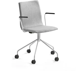 Eleganckie krzesło konferencyjne z podstawą 5-ramienną i pięcioma kołami. Siedzisko zintegrowane z oparciem. Krzesło tapicerowane wytrzymałą tkaniną. Wyposażone w smukłe podłokietniki. Elegancki design sprawia, że krzesło to stylowy dodatek do sali konferencyjnej. To stylowe krzesło konferencyjne doda atrakcyjności każdej sali konferencyjnej. Krzesło posiada siedzisko zintegrowane z oparciem oraz miękką wyściółkę zapewniającą wygodę nawet podczas długich narad. Oparcie delikatnie profilowane, siedzisko z zaokrągloną przednią krawędzią dla dodatkowego komfortu. Siedzisko jest wyściełane i tapicerowane trwałą tkaniną.