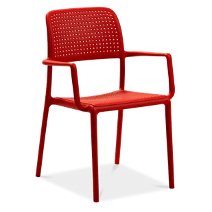 Krzesło Bora - finezja, design, nowoczesność. Zaokrąglone kształty nadaju krzesłu miękkiego wyrazu, a dziurkowane siedzisko i oparcie to jego znak rozpoznawczy. Wykonane z polipropylenu połączonego z włóknem szklanym, może być używane zarówno we wnętrzach, jak i na tarasie czy w ogrodzie. Krzesło posiada antypoślizgowe stopki oraz jest łatwe w sztaplowaniu. Występuje również w wersji z podłokietnikami.