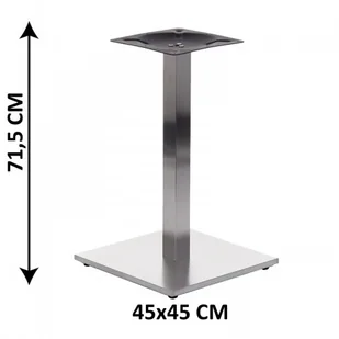 Podstawa stolika z nakładką ze stali nierdzewnej, obciążnik z tworzywa sztucznego. Przekrój elementu dolnego 45x45 cm. Noga o przekroju 6x6 cm.
