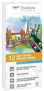 Podwójne pióro kulkowe "DUAL BRUSH PEN ABT", zestaw 12 kolorów podstawowych ak fibrowy z podwójną końcówką- Pisak fibrowy z dwiema końcówkami- cienka końcówka do precyzyjnych linii, szeroka końcówka pędzelkowa do płaskiego nakładania kolorów- wykonane na bazie wody- Kolory można mieszać ze sobą i kolorować akwarelami- 96 jasnych kolorów- bezzapachowe- Kolory nie są odporne na światłoZawartość: 12 sztuk, różne kolory: