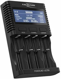 Ładowarka ANSMANN Powerline 4 Ultra do akumulatorów NiMH i Li-IonInteligentna ładowarka umożliwia jednoczesne ładowanie do czterech akumulatorów NiMH o rozmiarze Mignon AA (HR6) i Micro AAA (HR03), trzech akumulatorów Baby C (HR14), dwóch akumulatorów Mono D (HR20) lub czterech akumulatorów Li-Ion o rozmiarze 18650 - niezależnie od ich liczby, rozmiaru, pojemności i poziomu naładowania. Każde z 4 gniazd ładowania jest indywidualnie monitorowane i indywidualnie ładowane/rozładowywaneWyświetlacz LCDWyświetlacz ładowania pokazuje dla każdego gniazda ładowaniaPoziom naładowaniaNapięcie akumulatora (V)Prąd ładowania/rozładowania (mA)Pojemność (mAh)Czas ładowania (h)Możesz przełączać się między ładowarkami za pomocą przycisku "Channel"Rozmiary, które można ładowaćAkumulatory NiMH1-4× Micro AAA lub Mignon AA1-3× Baby C1-2× Mono DAkumulatory litowo-jonowe1-4× 18650, 18500, 17670, 16340, 14500. . . 1-3× 26650, 26500, 25500, 22650. . . 1-2× 32650. . . Złącze USBPraktyczne w podróży: