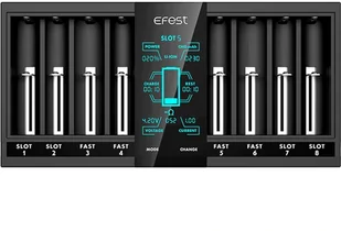 Ładowarka EFEST LUC V8 10440-26650 Li-ION/ Ni-MH/Ni-CD 8 kanałów, LCD HD, Power Bank EFEST LUC V8 to łatwe w obsłudze urządzenie, które może być używane jako ładowarka i Power Bank. Dzięki temu, może służyć do ładowania akumulatorów oraz np. smartfonów, tabletów itp. Posiada osiem inteligentnych gniazd ładowania, które działają niezależnie. Dziedziczy najlepsze cechy wszystkich ładowarek producenta EFEST. Może ładować akumulatory Li-ION 3,6/ 3,7V niezabezpieczone, o rozmiarach: 10440, 14500, 14650, 16340, 16650, 17650, 17670, 18350, 18490, 18500, 18650, 20700, 21700, 22650, 26500, 26650 oraz Ni-MH/Ni-CD 1,2V A, AA, AAA, C. Ładuje ogniwa dokładnie do 4.2V i automatycznie zatrzymuje proces, po zakończeniu ładowania.