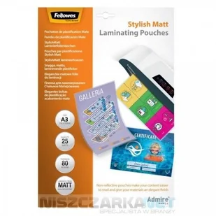 kod: 5602201 Folia do laminowania Fellowes format A3 - 303x426mm Grubość 80 mikronów Opakowanie 25szt Folie do laminacji matowe, antyrefleksyjne Zapobiegają powstawaniu odblasków przy kopiowaniu czy też robieniu zdjęć Można po niej pisać - ścierać - pisać Folie o grubości 80 mikronów są przeznaczone do laminacji notatek, dokumentów i zdjęć.