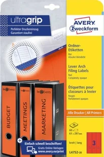 Etykiety na segregatory, szerokie, długie Posiadają unikalną i nowoczesną technologię UltraGrip: trójwymiarowa powierzchnia na arkuszach gwarantuje równomierne pobieranie i prowadzenie etykiet w drukarce Do zadruku w drukarkach atramentowych, laserowych i kserokopiarkach Silnie przylegają do grzbietu segregatora oraz doskonale zakrywają stare oznaczenia Pasują do większości szerokich, długich segregatorów dostępnych na rynku Wybrane modele dostępne w różnych kolorach Darmowe i łatwe w użyciu szablony oraz oprogramowanie dostępne na stronie www. avery-zweckform. pl Rozmiar etykiety 61 x 297 mm Ilość etykiet na arkuszu 3 Ilość arkuszy w opakowaniu 20 w formacie A4 Ilość etykiet w opakowaniu 60 Kolor czerwony Kod producenta L4752-20 Nr oferty xSale ZW482-3