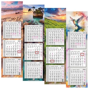 EV-Corp Kalendarz 2026 trójdzielny wąski płaski mix. Kalendarz. * kalendarz ścienny, trójdzielny, wąski z główką płaską z zadrukiem na całych pleckach * produkt sprzedawany losowo - mix 6 rodzajów plecków: Sardynia, Mazury, Bałtyk, Tatry, Pieniny, Gracja Kos* wymiary: 19,5 x 68,8 cm* układ. . .