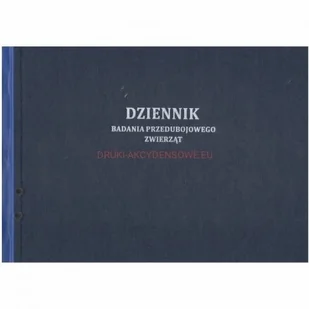 Przedmiotem tej transakcji jest: Dziennik badania przedubojowego zwierząt Wykonany w formie księgi format A4, objętość 100 kartek, strony numerowane, oprawa twarda standard, napis tłoczony na gorąco. Księga zawiera instrukcję wypełniania. Książka jest przeznaczona do dokonania 1000 wpisów. Podstawa prawna: