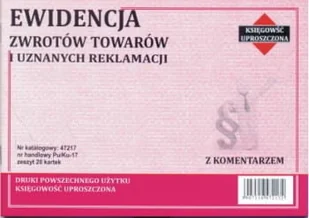 Przedmiotem tej transakcji jest ewidencja reklamacji i zwrotów. Druk wykonany w oprawie zeszytowej - albumowej, format A5 (210 x 148 mm), objętość 20 kartek. Podstawa prawna stosowania druku: Rozporządzenie Ministra Finansów z dnia 15 marca 2013 r (Dz. U. z 2013 r., poz. 363 z pózn. zm.) Zgodnie z obowiązującą ordynacją podatkową, przedsiębiorca ma obowiązek prowadzić ewidencję reklamacji i zwrotów. Dokonane w tej ewidencji wpisy, poparte dokumentami takimi jak list przewozowy, czy pokwitowanie odbioru przesyłki, są podstawą do uwiarygodnienia faktur korygujących, wystawianych w związku ze zwrotmai oraz kosztów poniesionych przez przedsiębiorę w związku z procedurą reklamacyjną.