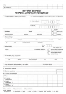 Przedmiotem tej transakcji jest druk: Historia choroby poradnia zdrowia psychicznego [Mz/Ps-1] format A3, złożony do A4 wymiary 420x297 mm wymiary po złożeniu 297x210 mm jedna historia choroby składa się z 4 stron opakowanie zawiera 100 historii choroby papier offsetowy 80 g/m, biały nadruk czarny po obu stronach Zastosowanie: dokumentacja medyczna pacjenta przychodni zdrowia psychicznego, w której gromadzona są informację o pacjencie i środowisku, w którym funkcjonuje oraz badaniach i pobytach w szpitalach.