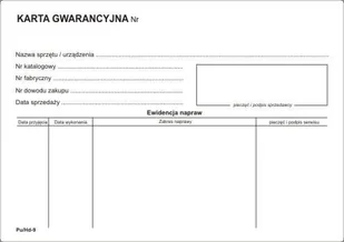 Przedmiotem tej transakcji jest druk Karta gwarancyjna wykonany na kartoniku białym o gramaturze 250 g. dostępna na sztuki lub w opakowaniach 100 szt, Druk uniwersalny przeznaczony zarówno jako dowód udzielonej gwarancji dla sprzętów i urządzeń do użytku domowego jak i komercyjnego.